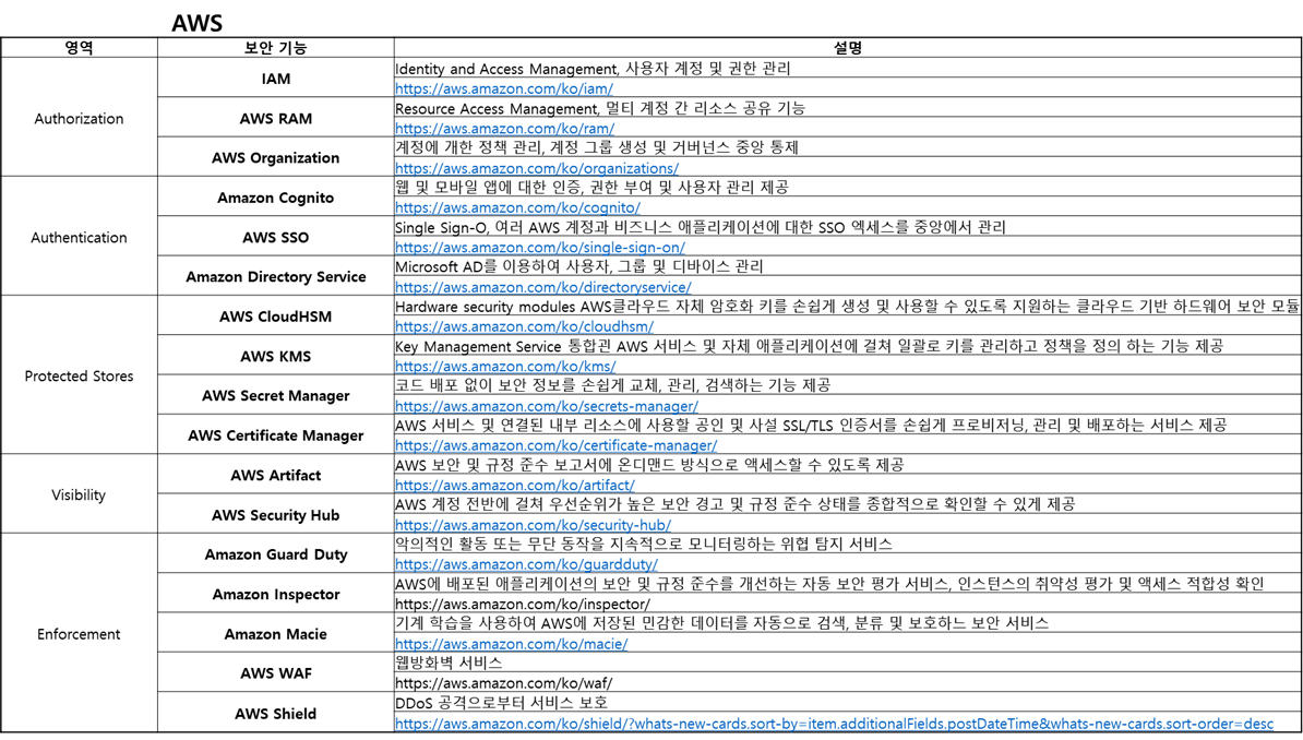 클라우드 서비스 제공자별 보안 기능 요약_자료.xlsx