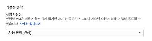 4. 선점형 인스턴스는 일반 VM 인스턴스로 라이브 마이그레이션하거나 유지보수 이벤트 발생 시 자동으로 재시작하도록 설정할 수 없습니다.