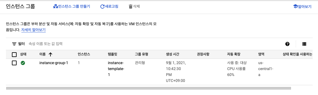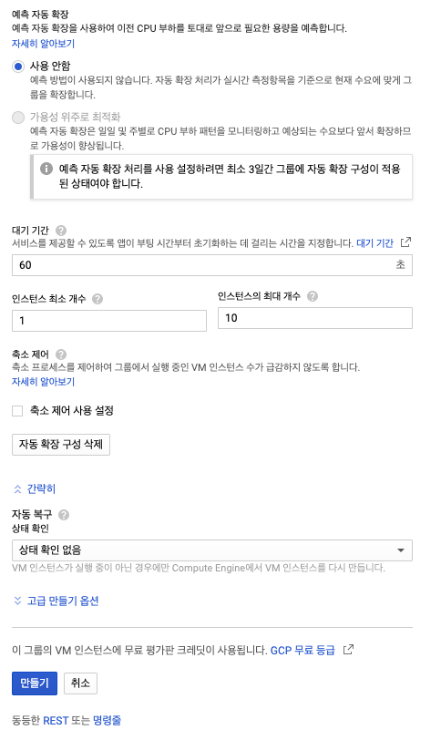 Compute Engine -> 인스턴스 그룹 선택 -> 인스턴스 그룹 만들기 -> 관리형 인스턴스 그룹 선택 -> 인스턴스 템플릿 선택 -> 자동 확장 모드를 자동 확장 선택 -> 인스턴스 최소 개수 및 최대 개수 확인
