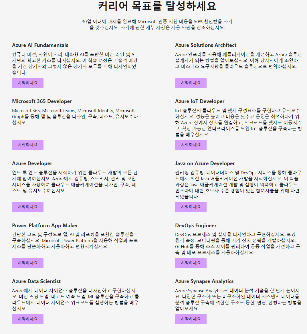 종종 MS에서 진행하는 교육을 수료하면 무료로 시험을 볼 수 있는 바우처를 주고는 했는데 요즘에는 코로나 때문인지 몰라도 조금 뜸해진 거 같습니다.